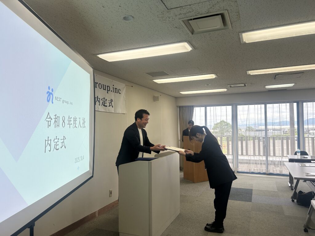 内定式では社長と役員の挨拶、内定証書の授与、課題の説明等が行われました。